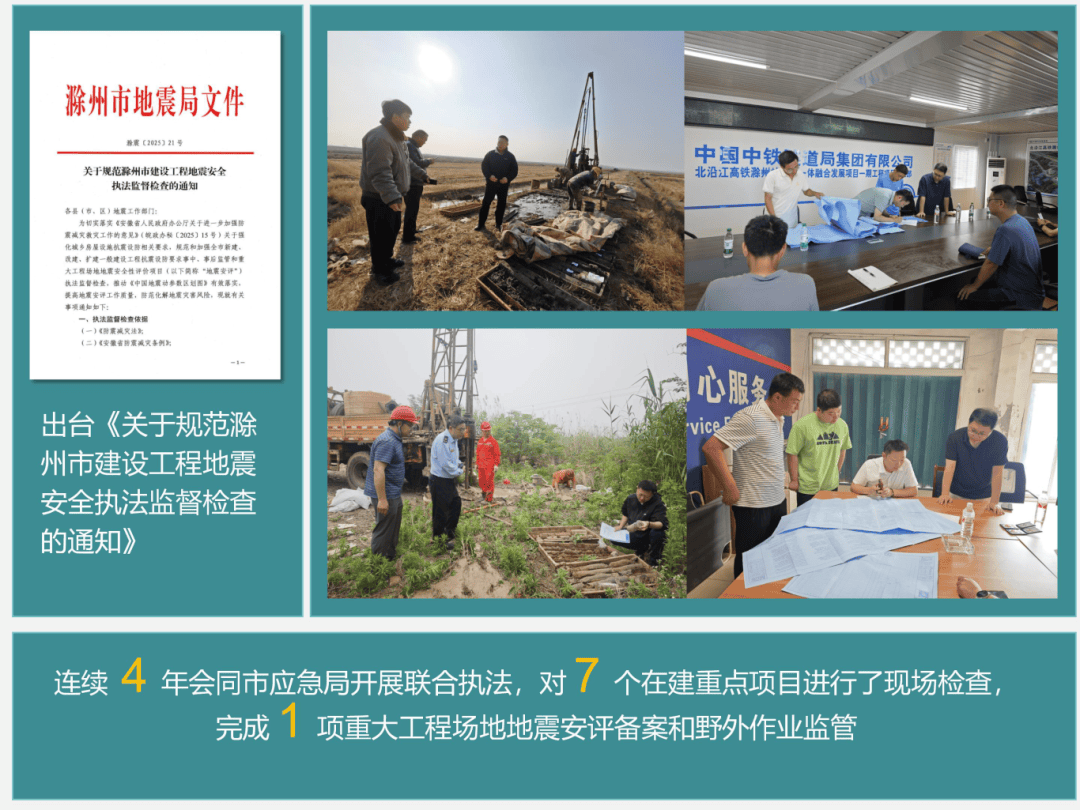 出台《关于规范滁州市建设工程地震安全执法监督检查的通知》,进一步规范了抗震设防执法监管行为。连续4年会同市应急管理局印发工作通知,持续建立联合执法机制,联合多部门对7个在建重点项目进行了现场检查,完成1项重大工程场地地震安评备案和野外作业监管,并同步宣传《工程场地地震安全性评价》新国标和《安徽省重大工程场地地震安全性评价项目范围清单》等政策规定。