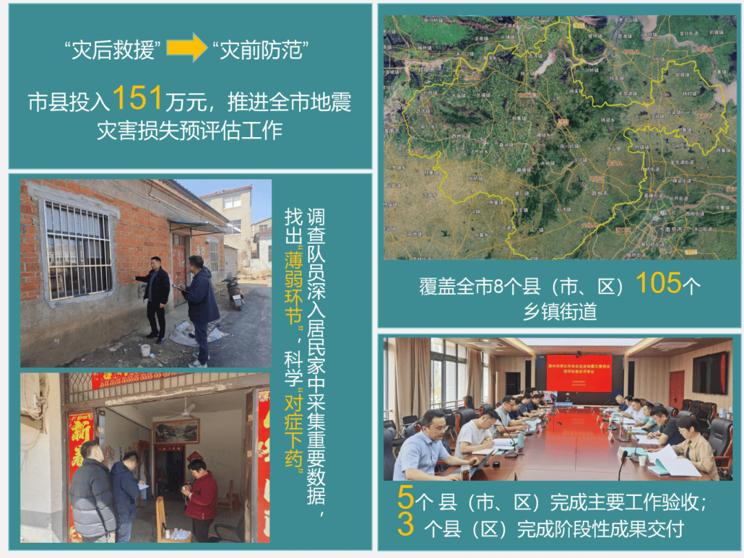 坚持从“灾后救援”向“灾前防范”转变,推进全市地震灾害损失预评估工作。市县先后投入151万元,组织工作队和专业机构,深入乡镇、村庄,走入千家万户,对房屋年代、结构形式、抗震特性等关键信息进行收集汇聚,用计算模型对成片区域进行地震模拟演算,找出“薄弱环节”,科学“对症下药”。现已覆盖全市8个县(市、区)105个乡镇街道,覆盖率超过90%。5个县(市、区)完成主要工作验收;3个县(区)完成阶段性成果交付。