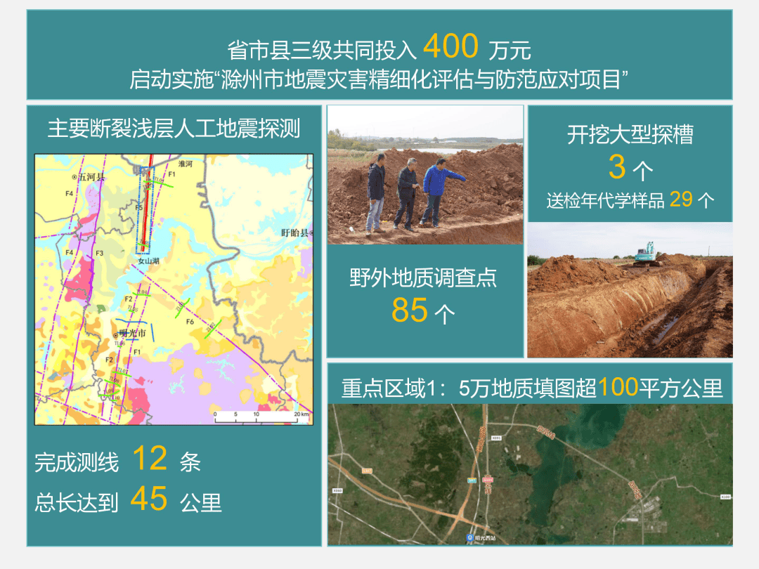 排查和防范地震灾害风险,我们始终在路上。2025年,省市县三级凝聚强大合力,共同投入400万元启动实施“滁州市地震灾害精细化评估与防范应对项目”,野外工作队日夜兼程,震源车辆驶入山岭林地,先后完成了浅层地震勘探测线公里;调查队员在陡坎、田间勘察地质调查点85个;沿着断裂带的“蛛丝马迹”开挖大型探槽3个,送检年代学样品29个,绘制重点区域地质填图,面积超过了100平方公里,进一步掌握地震构造风险源及震灾风险防治薄弱环节,为切实筑牢地震安全防线提供科学依据。